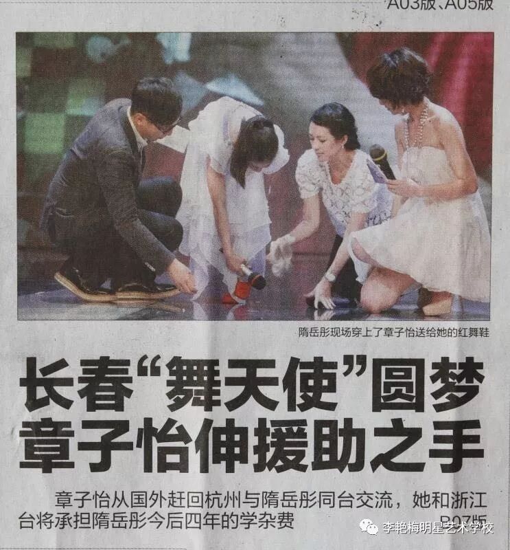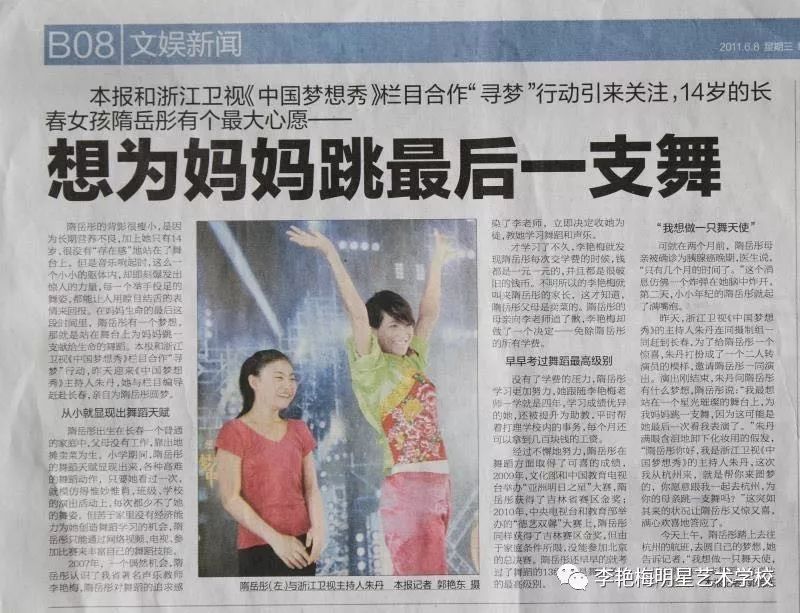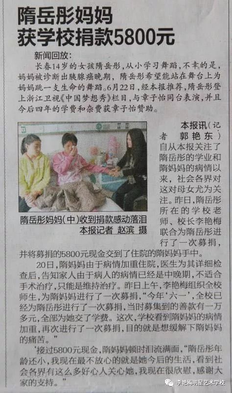 长春14岁女孩隋岳彤,从小学习舞蹈,不幸的是,妈妈被诊出胰腺癌晚期,隋岳彤希望能站在舞台上为妈妈跳一支生命的舞蹈。6月22日,经本报推荐,隋岳彤登上浙江卫视《中国梦想秀》栏目,与章子怡同台表演,并且今后四年的学费和学杂费获章子怡赞助。