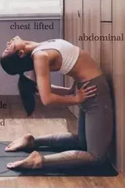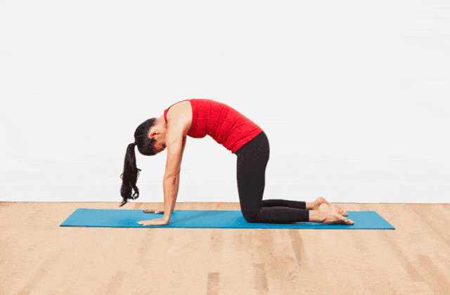 吸气时盆骨向上,腰向下微曲,形成一条弧线,眼睛微微向上看。呼气时背部慢慢上拱,带动脸向下方,视线集中在大腿,直至背部有伸展的感觉。