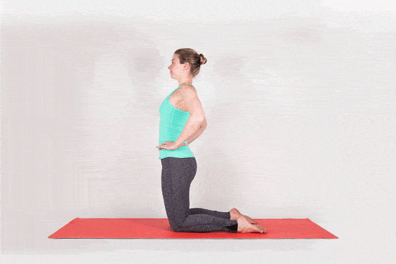 跪立,双脚打开与髋同宽,小腿及脚背贴地,脚尖指向正后方。双手扶髋挺胸抬头,脊柱向上延伸。