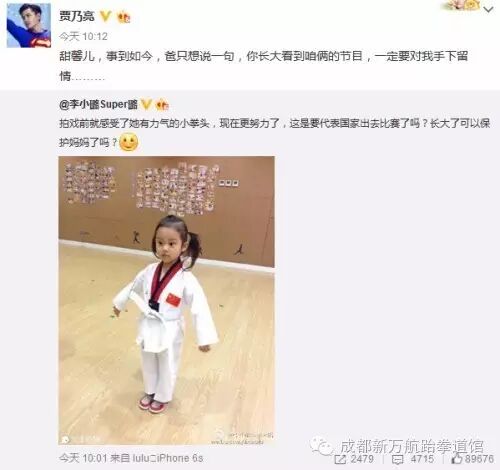李小璐在微博晒出一张女儿甜馨穿跆拳道服的照片,并附文称:“拍戏前就感受了她有力气的小拳头,现在更努力了,这是要代表国家出去比赛了吗?长大了可以保护妈妈了吗?”