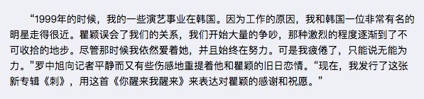 这段感情结束后,两人似乎都不是很留恋,罗中旭在专辑发布会上评价瞿颖不适合做女友