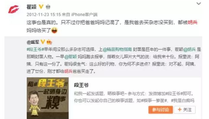 两人家里的关系也很亲近,戴军曾在微博上爆料:当年两人上了《精品购物指南》封面,瞿颖爸爸想去报刊亭买这本杂志,结果被告知,报刊亭进的20份全被胡兵妈妈买走了。