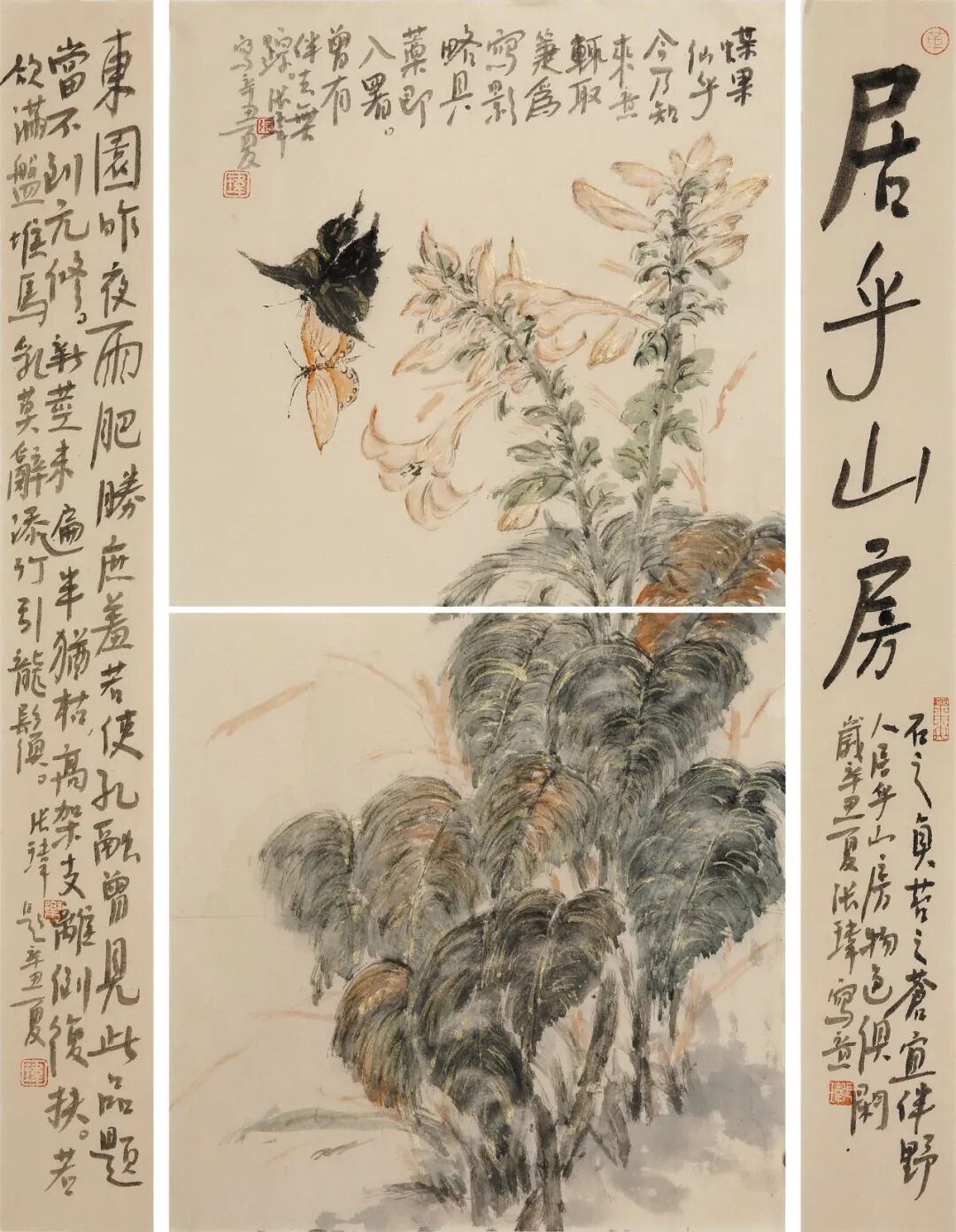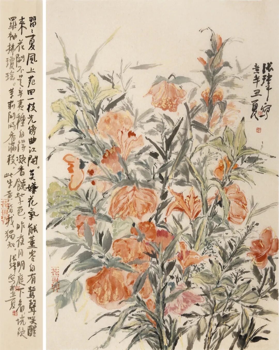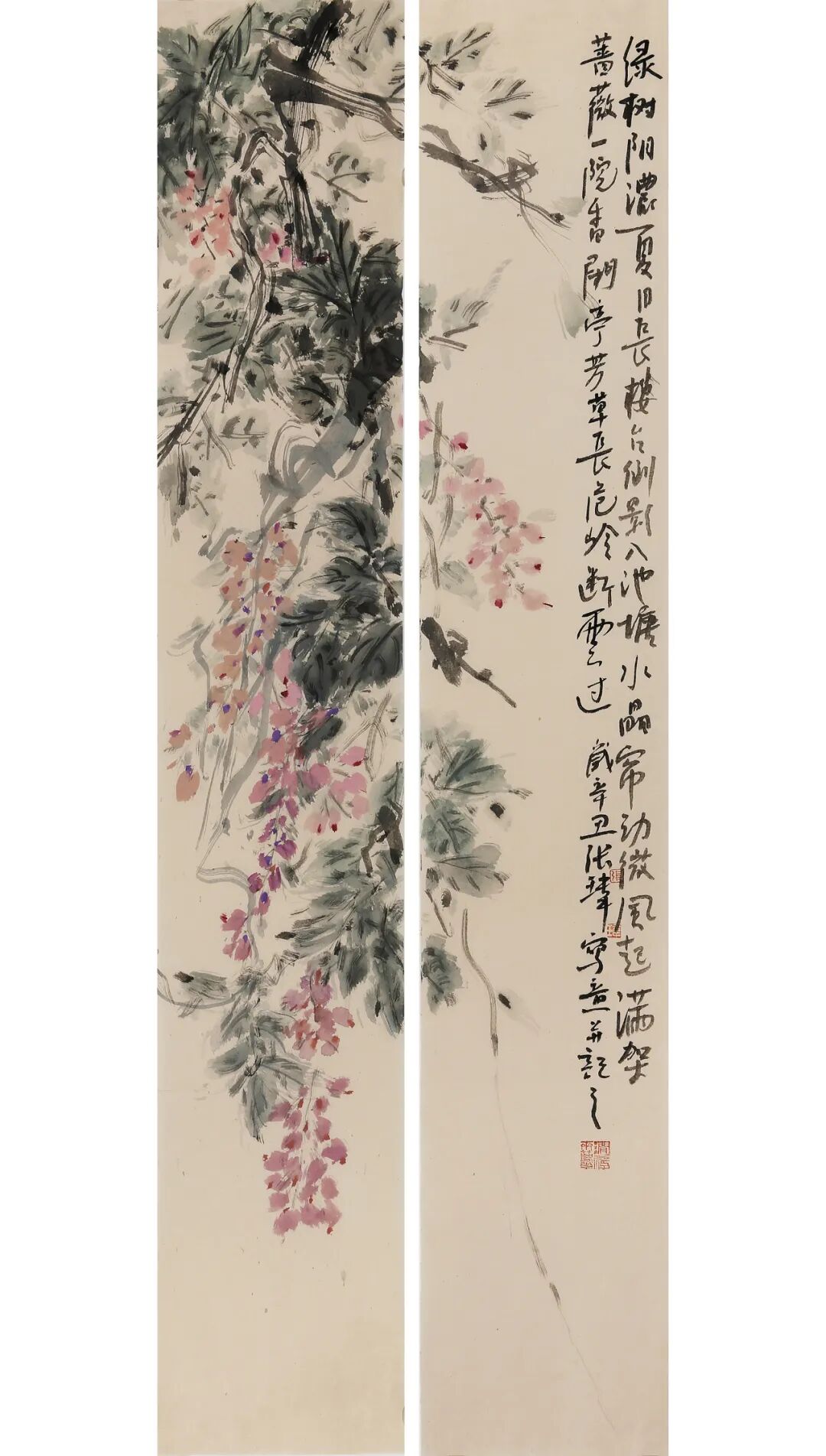张玮花卉通景对屏《绿树阳浓夏日长》