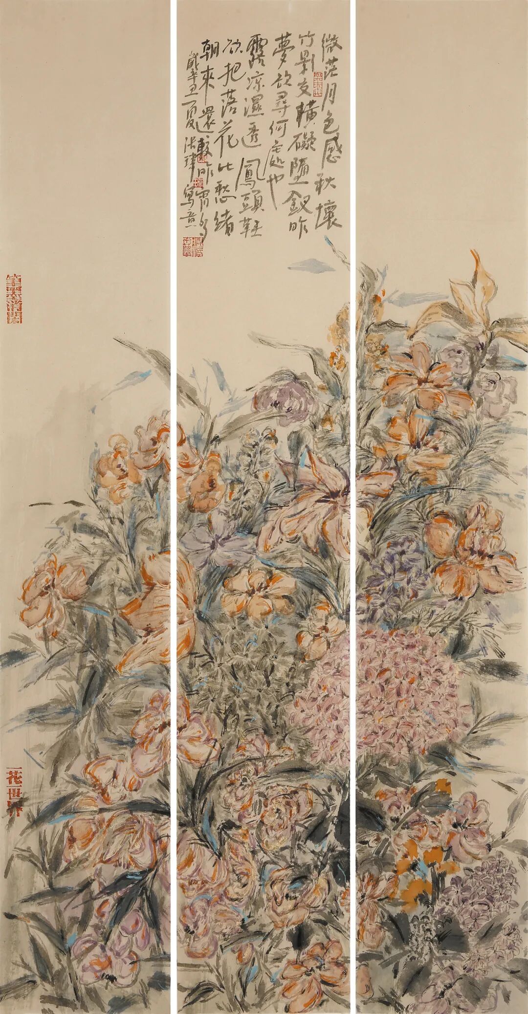 张玮最新花卉通景三条屏《微茫月色感秋怀》
