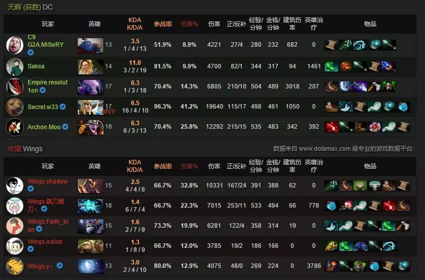 阵容情况:Wings给跳刀跳刀拿了中单卡尔,配大哥虚空,SK和大鱼双控,神域救人;DC拿小娜迦针对虚空,优势路电魂中单W33的pom,加上末日毒狗。