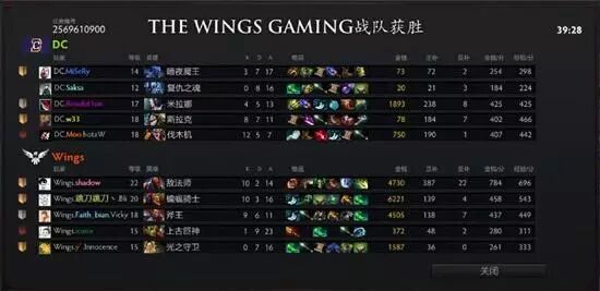 37分,小鱼买活的情况下一人开隐刀深入wings半场,单杀斧王失败自己买活死!WINGS直接中路上高击杀VS夜魔,DC根本无力守塔,WINGS离冠军近在咫尺,小鱼还没复活,wings已经破掉中路高地,DC还想打追击,POM跳上去被敌法大晕直接秒杀,WIGNS不走了直接推最后一路,蝙蝠跳拉小鱼完成击杀!DC打出GG,恭喜WINGS,TI6冠军!!!