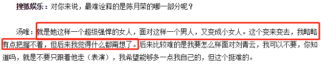 尽管电影上映后好多人把她夸上了天,但汤唯自己清楚表现得不好,说导演许鞍华也难掩失望。