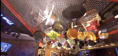 看完了装修,接下来芭姐要带你进入今天最重要的主题——吃!芭姐一进门就被天花板给吸引住了,这锅碗瓢盆都飞到天花板上去了!