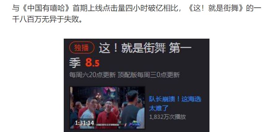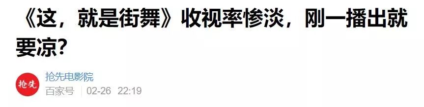 于是我们在优酷首播的两天后,看到了一些整齐划一的嘲《这就是街舞》的稿子,重点放在收视率上(记住这个词,它是这场宣传battle的焦点)▼▼▼