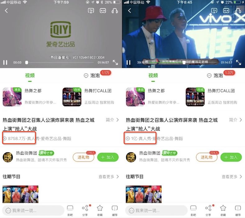 从晚上7:59的截图来看,爱奇艺确实已经有8758.7万次观看了,相当于40分钟播完,实际播放量也就一千来万▼▼▼#但是这个数据难道不是和优酷播出的第一集一样吗,说明街舞节目差不多就是这个关注度啊#