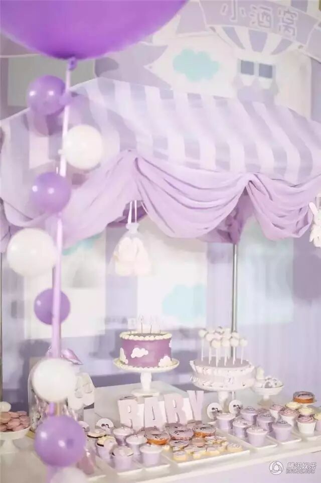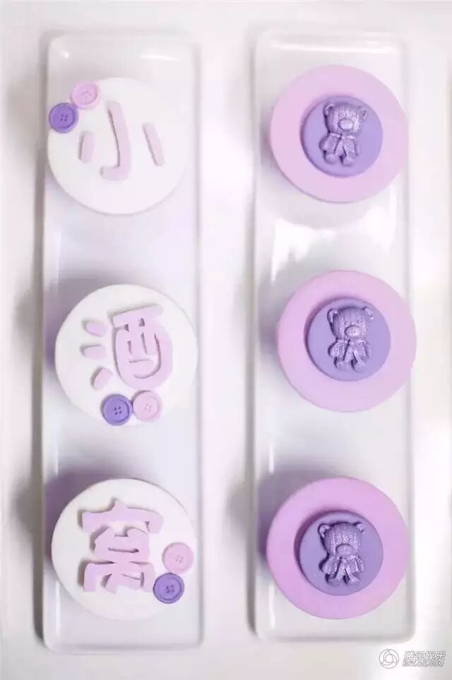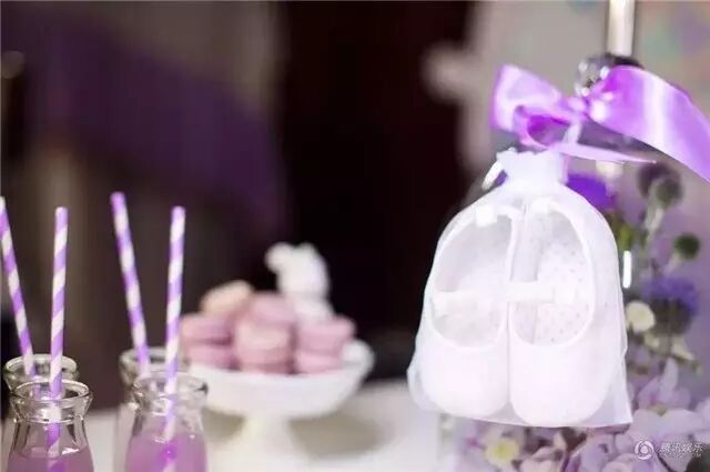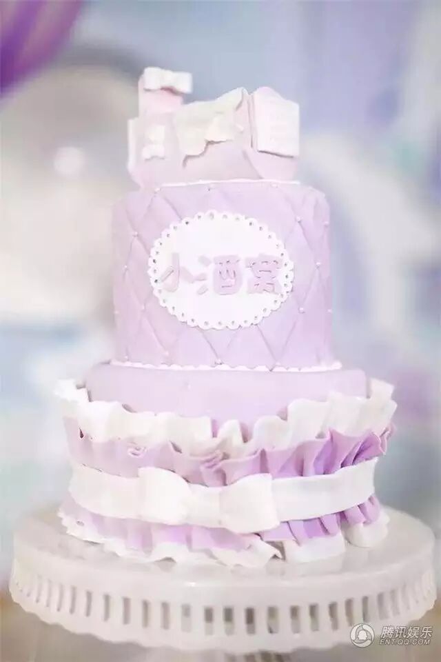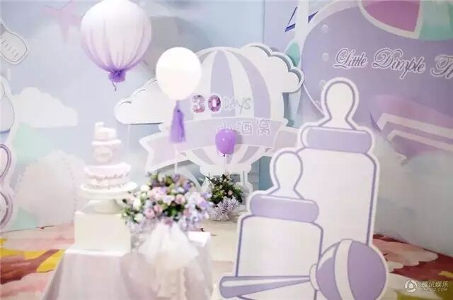 从现场照片来看,满月宴现场以淡紫色和白色为主题,背景板上写着“陪你看世界”,现场甜点区也被专门制作成了“小酒窝”专属,淡紫色的生日蛋糕、小熊饼干以及紫色的饮料等,一句话:好温馨好浪漫!