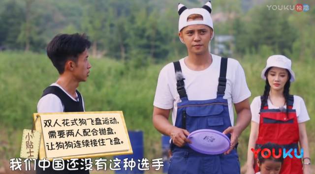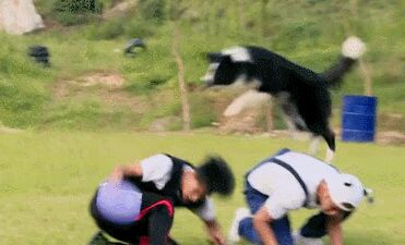 训犬师邀请小猪和他一起完成“双人花式狗飞盘运动”,动作非常复杂,首先小猪弓背弯下身子,训犬师从他的背翻跃过来,之后小狗牧歌过来踩小猪的身子,训犬师去抛盘子让牧歌来接,然后小猪站起来让牧歌接第二个盘子。