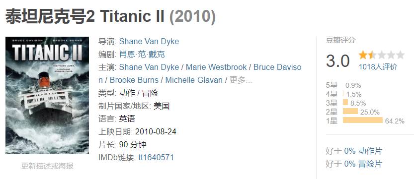 影片质量如何?看看一位网友的神评论吧:不管是叫《泰坦尼克号2》,还是叫《泰坦尼克2号》,这部电影,都拍得太2了!