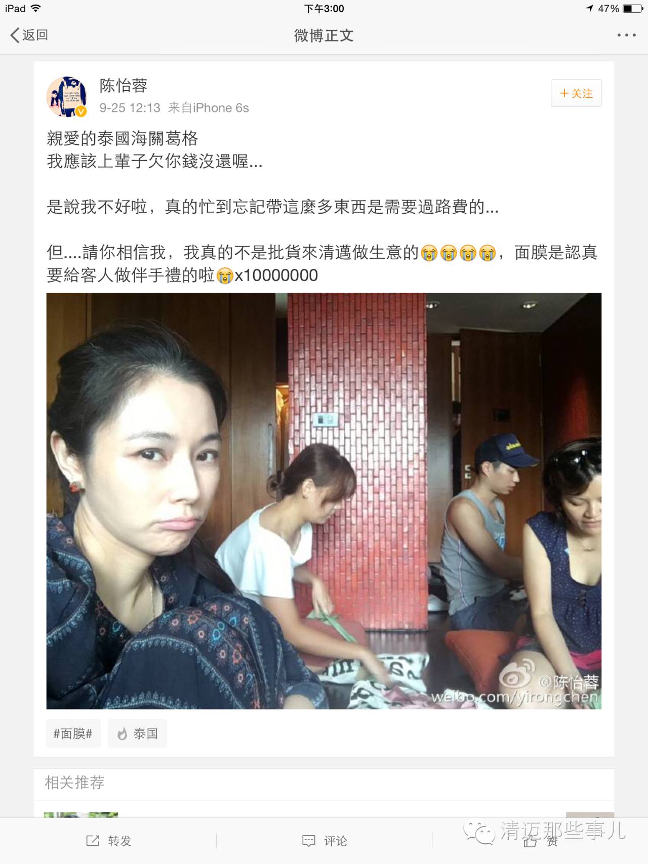 陈怡蓉上个月到泰国筹备婚礼,因行李夹带玩漆弹留下的弹壳,行李遭海关扣留盘查,昨婚礼前也发生插曲,淮备送宾客的面膜遭泰国海关扣留,被指面膜内含有药物反应,她苦笑说,真的不是批货拿来贩售,“我应该上辈子欠你(海关)钱没还,真的忙到忘记带这么多东西是需要过路费的。”最后价值40万台币的面膜被没收,并补3万多台币的税金才过关。