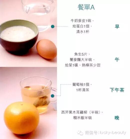 1/ 燕麦粥1碗、2/豆奶1杯、3/两只鸡蛋(可以去蛋黄)、 4/ 茄汁焗豆1/3杯、5/ 低脂乳酪、6/ 金枪鱼(鱼类)1/4条、7/ 鸡胸肉3两、8/ 豆腐1砖、9/ 肉酱全麦天使意粉半碟、10/ 香蕉1只、11/ 鱼生5片、12/ 牛奶1杯、13/ 西式杂豆1/3杯