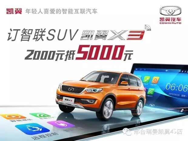 正所谓,青春不老,阳光正好!重要的事情再说一遍,即日起凯翼X3全面接受预订,交2000抵5000、逢“6”保养免费、千元免费流量、集赞尊享VIP礼等超值优惠,欢迎有购车意向的客户到店咨询。