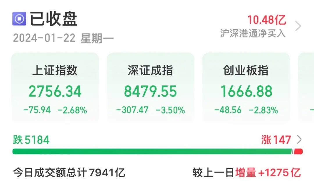 A股三大指数今日集体大跌,截至收盘,沪指跌2.68%,深成指跌3.5%,创业板指跌2.83%,北证50指数跌4.3%,沪深两市成交额7941亿元。两市超5100只个股下跌,北向资金净买入10.48亿元。