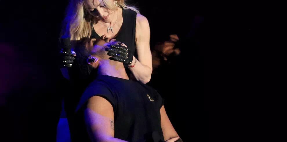 Madonna扑向了年仅28岁的Drake,接着Madonna在舞台上亲了他,或者修正一下用词,强吻了Drake。Drake感受到万般的无力,挥舞着双臂。