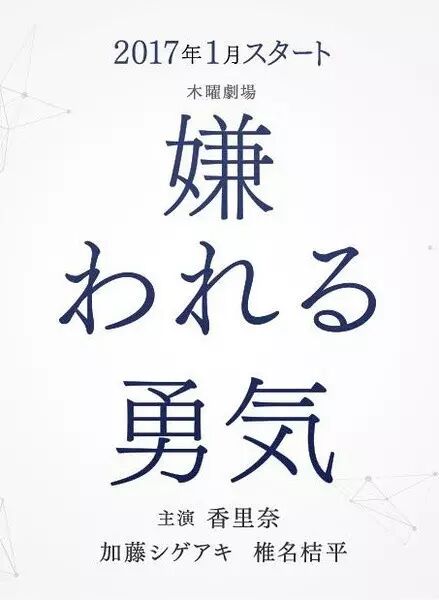 主演: 香里奈 / 加藤シゲアキ / 椎名桔平简介:阿德勒心理学认为,人的烦恼全部来自于人际关系,如果一个人不再惧怕别人的眼光,不再介意是否会被别人讨厌,拥有“被讨厌的勇气”才能真正走上属于自己的人生。