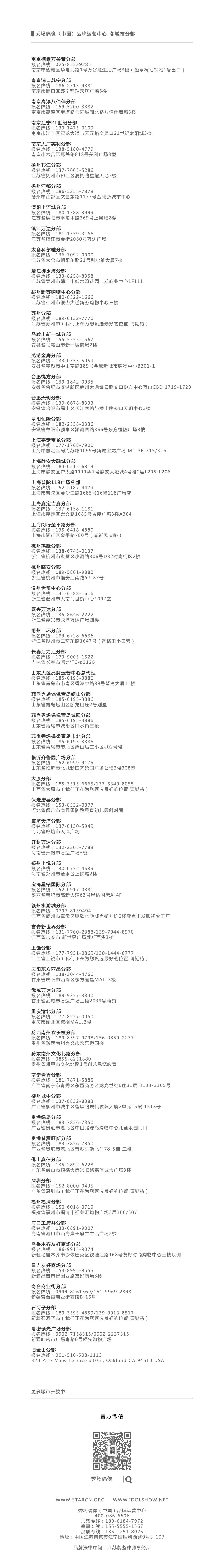 目前已入驻中国22个省市开设了七十余家的高端儿童情商艺术连锁教育品牌机构。品牌旗下的秀场偶像国际少儿模特大赛及秀场偶像国际儿童时装周均覆盖全球100城市。加入秀场偶像,让孩子获得属于自己的荣耀,恣意展现自己的魅力,与秀场偶像共同创造新的奇迹。