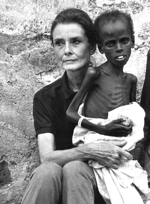 奥黛丽赫本终其一生都关注着慈善事业,不遗余力的利用自己的财富和影响力,唤起国际社会对索马里、苏丹等落后国家儿童生存状况的关注。奥黛丽赫本多次不顾战乱和传染病的危险,到非洲去,到那些地球上苦难最深重的角落去,去拥抱和帮助那些饱受折磨的儿童。