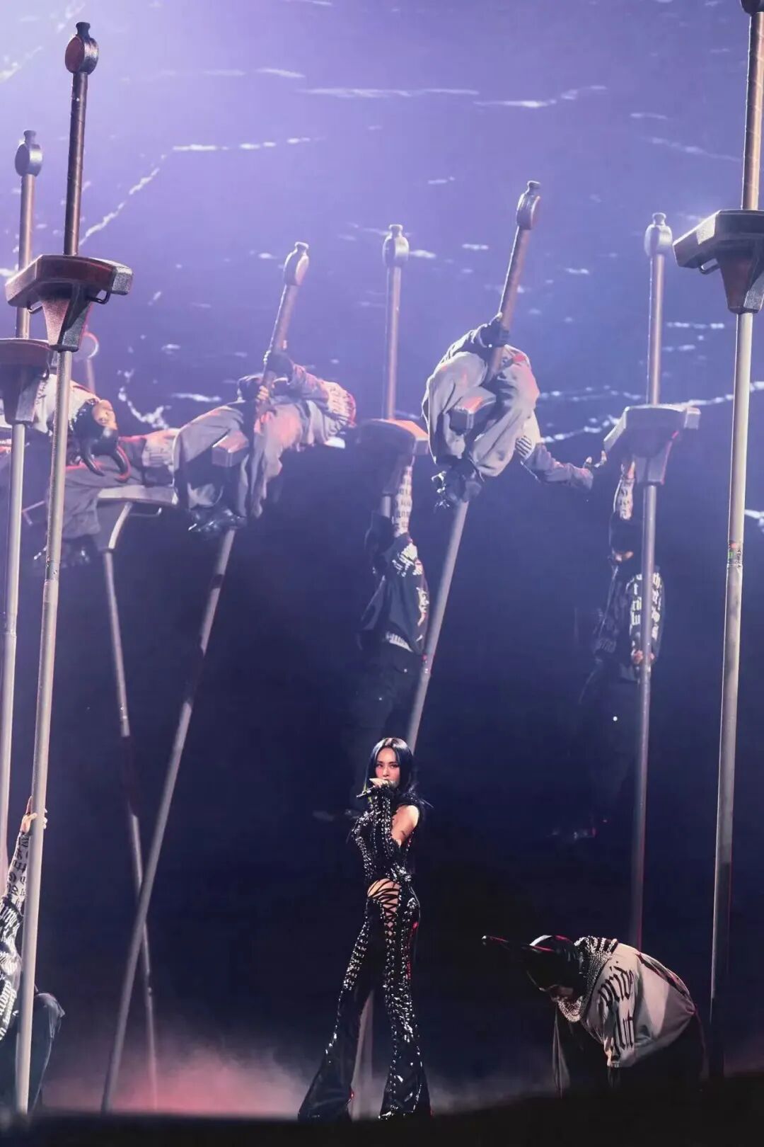 当《你也有今天》的旋律响起,舞台中央瞬间化身为“剑之丛林”——20多位特技演员徒手攀上10米高杆,凌空翻跃、精准卡点,每一个惊险动作都完美踩在音乐的鼓点上,现场尖叫分贝瞬间爆表。