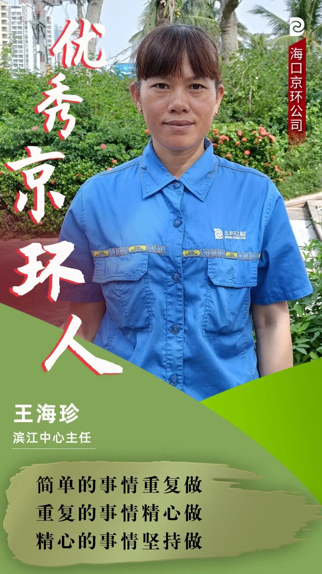在海口京环公司滨江中心,有这样一位优秀的环卫工作者,自2011年加入环卫行业以来,始终坚守在环卫一线,用满腔热忱和无私奉献书写着环卫人的光辉篇章。她就是现任滨江中心主任的王海珍。她怀揣“简单的事情重复做,重复的事情精心做,精心的事情坚持做”的信念,践行着时传祥“宁愿一人脏,换来万家净”的崇高理念,成为新时代环卫人的先进榜样。