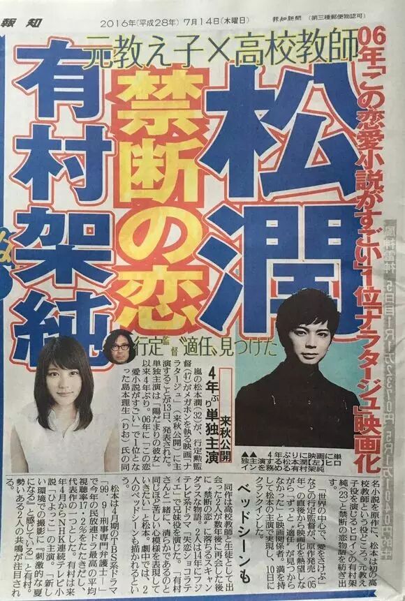 松本润和有村架纯并非第一次合作了,在《失恋巧克力职人》中二人饰演兄妹,而现在演禁断的师生恋,还有点小小的不适应。不过两人表示,将和staff一起努力拍出好作品。同时导演也以来年爱情电影的NO.1为目标。