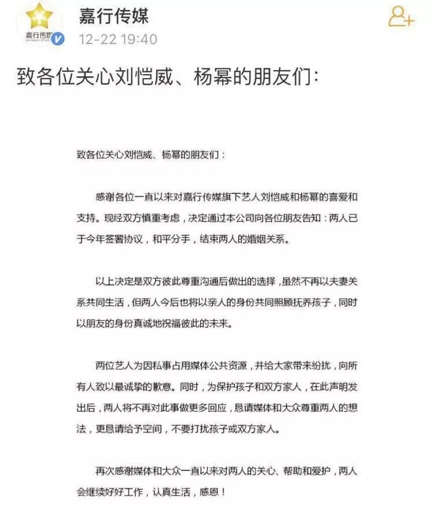 杨幂、刘恺威所属经纪公司嘉行传媒发声明,宣布两人于今年签署协议,和平分手,婚姻结束。离婚是双方彼此尊重沟通后做出的选择,未来将以亲人的身份共同照顾抚养孩子,以朋友身份真诚地祝福彼此的未来↓↓