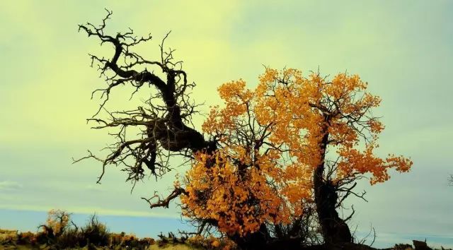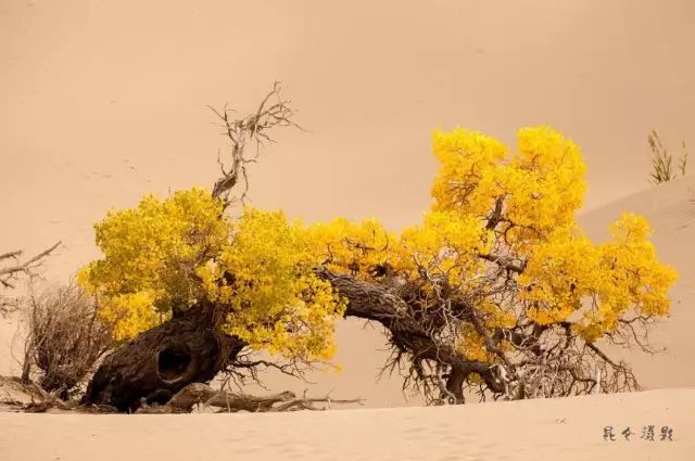 置身于此,看那风骨犹存的枯干半埋在沙里,无奈的让风将枝头的黄叶一阵阵吹去,正在成长的小树摇摆飘荡,怎不令人百感交集,荡气回肠。
