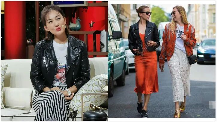 皮衣配长裙,中性和柔美的结合,娘man风的延续。白色印花T恤搭配黑色皮衣,中性中混搭了一丝天真可爱,下面的竖条纹长裙更有文艺气息,一个中年女性不过多追随潮流,而是有自己的品位,既酷又时尚,还透露着一颗童真的心。
