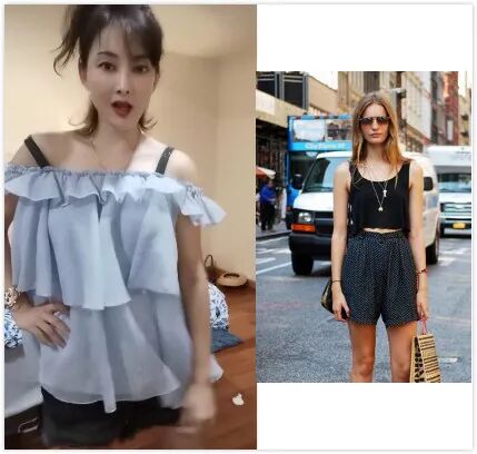 吊带衫配短裤,简单又大方。牛莉穿带花边的吊带衫,扎起一个高马尾,看起来有些泼辣。下身搭配牛仔短裤,牛仔材质的硬朗中和了上身的柔美,她总是善于平衡整体穿衣中过于女生化和幼稚的单品,怪不得看上去成熟自然,又不至于装嫩。