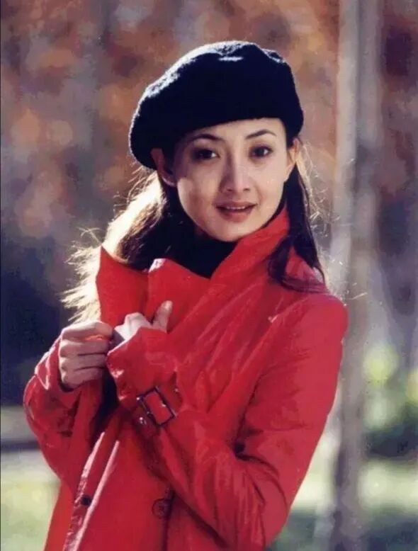 红色的皮衣有些朋克风,袖口的铁扣还带着金属气质,立领的风格更干脆利落,长发披肩戴一个贝雷帽,真是一个仙气又有些酷的小姐姐。贝雷帽和皮衣在现在也是很流行的元素,当年她就穿上了,实在品位不俗 。