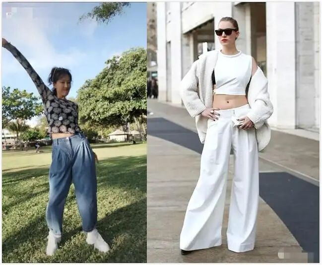 阔腿裤很修饰腿型,但是如果上身搭配不好也会出偏差。最简单的搭配法则就是短T配阔腿,或者紧身上衣配上阔腿裤,打造上窄下宽的效果,秀出高腰线和大长腿。蓝色阔腿牛仔裤搭配白色运动鞋,很有活力,上半身紧身印花T恤,图案成熟大气,不至于太过孩子气,对于中年女性够友好,也不至于装嫩。