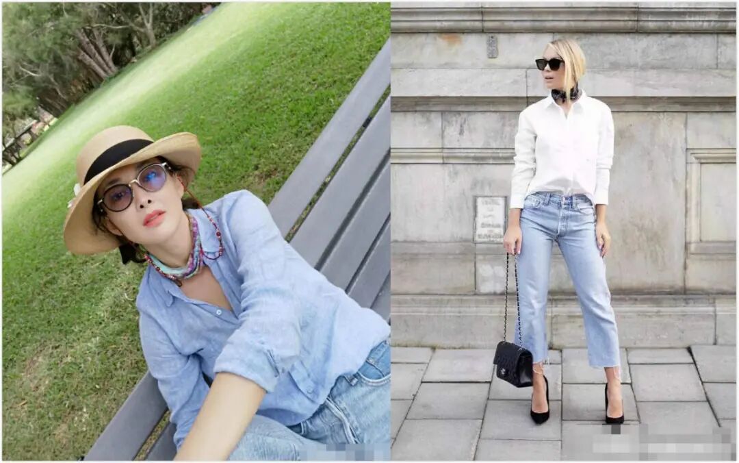 衬衫配牛仔裤是经典搭配,而牛莉在外出游玩时选择同色系穿搭,同样清新的蓝色衬衫和牛仔裤搭配,更加治愈有活力。包括领口的丝巾还有敞开的纽扣,露出锁骨更加迷人。墨镜还有礼帽,显得休闲又田野,更有原生气息。