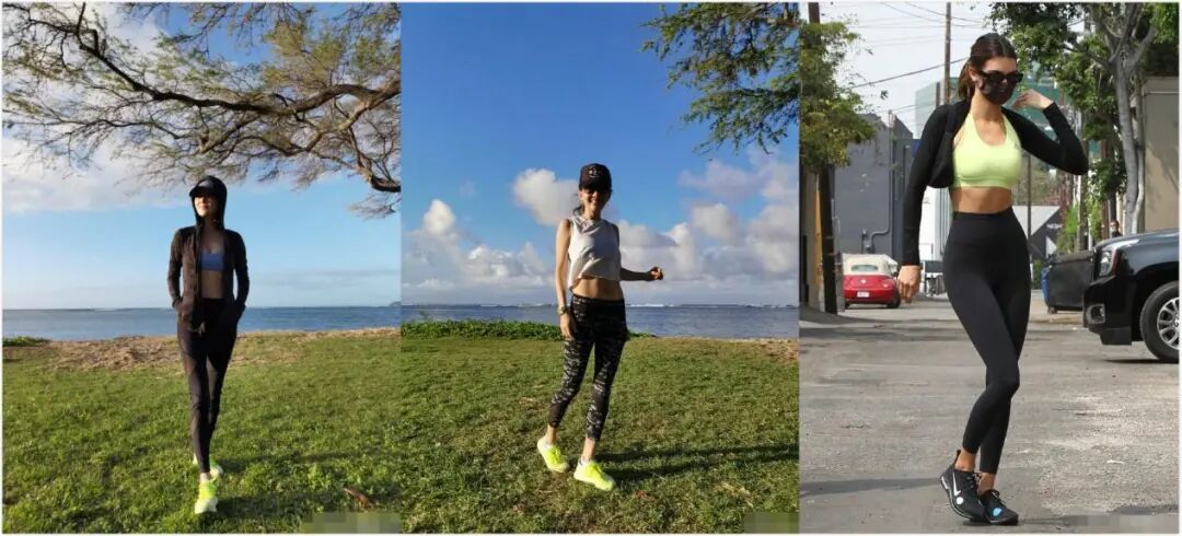 健身裤配上短T恤也是一些身材好的时髦星人热衷的出街方式,牛莉内搭运动内衣穿上外套,紧身裤秀出大长腿,还有腹部的马甲线实在让人羡慕,脚下的荧光绿鞋子很是吸睛,更加休闲随意的是她还戴了鸭舌帽,更加有活力。