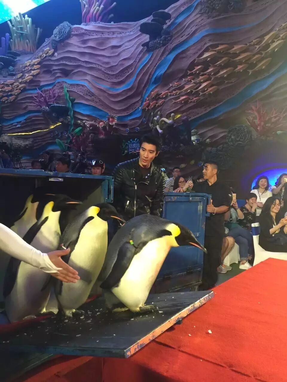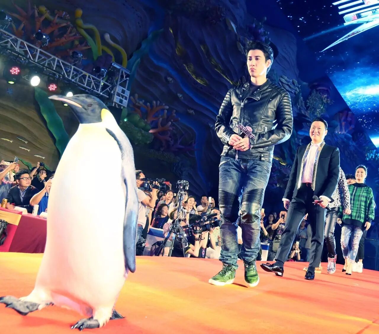 5月12日晚,由江苏卫视与灿星制作携手打造的中国首档EDM音乐节目《比亚迪·盖世音雄》在珠海长隆国际海洋度假区举行了新闻发布会。现场,王力宏、鸟叔、哈林、凤凰传奇四组队长大谈手下爱将,掀起全场高潮。值得一提的是,数只企鹅也来暖场助兴,为几位队长引路开道。它们摇摆前行的可爱模样也逗得现场欢笑连连。