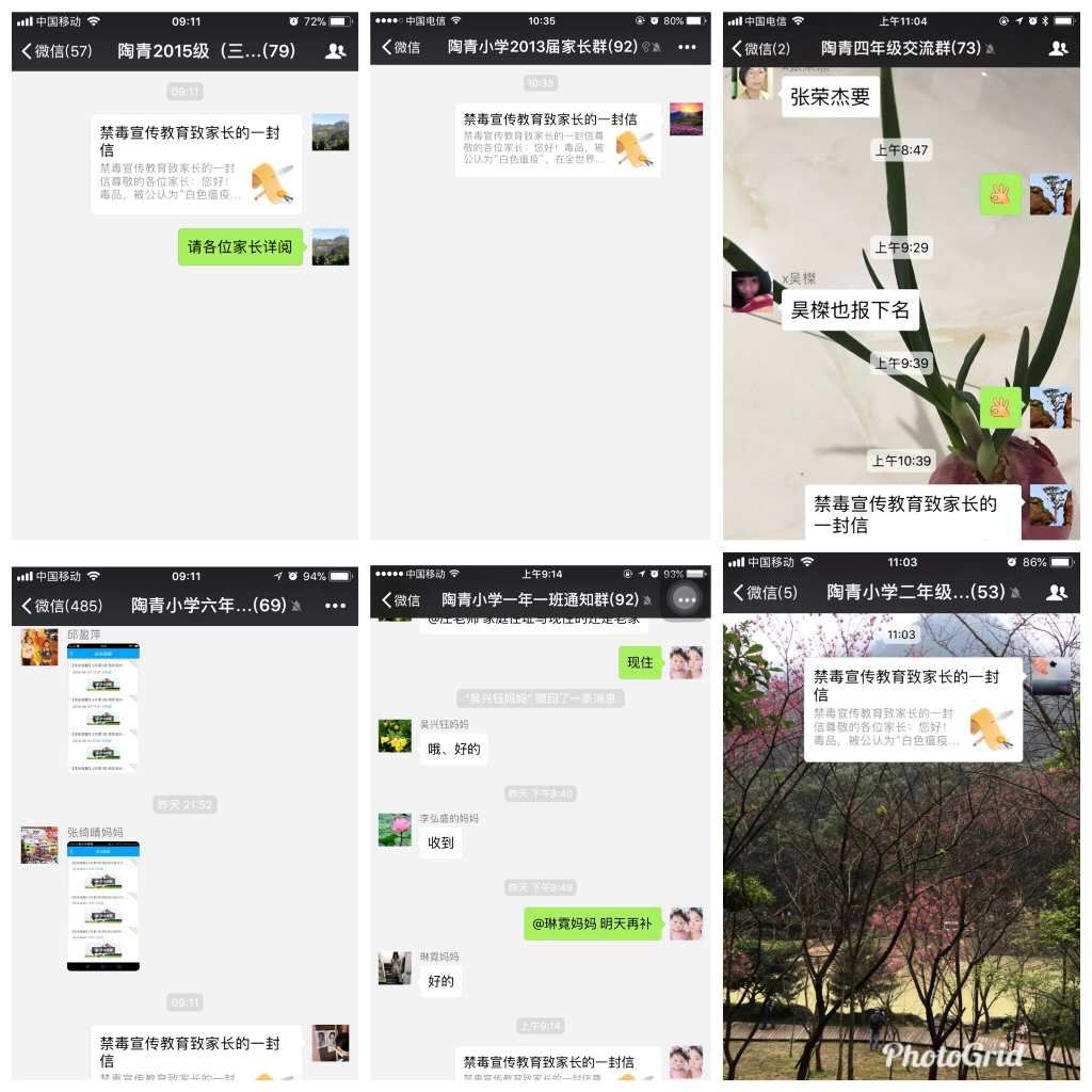6.利用学校公众号、各班微信群向广大家长转发“禁毒宣传才能教育致家长的一封信”, 全面提升市民的识毒防毒拒毒能力和禁毒意识,进一步净化社会环境。