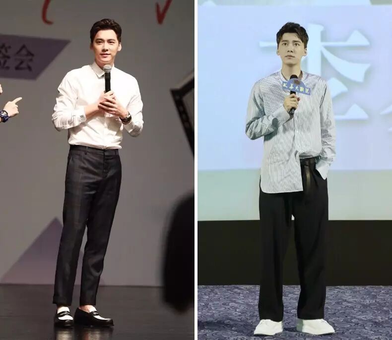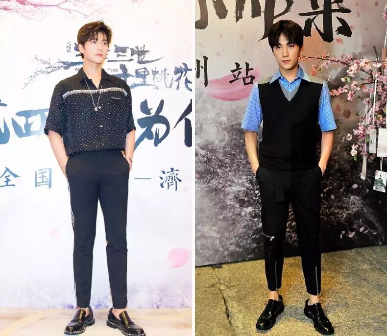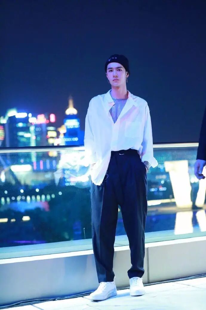王一博本周参加某活动也选择了衬衫,他这一身其实和李易峰那身有异曲同工之处,都是宽松衬衫阔腿裤,然后衬衫塞一半衣角,这样哪怕是简单的配色也都能穿出高大上的赶脚,但前提是要高瘦。
