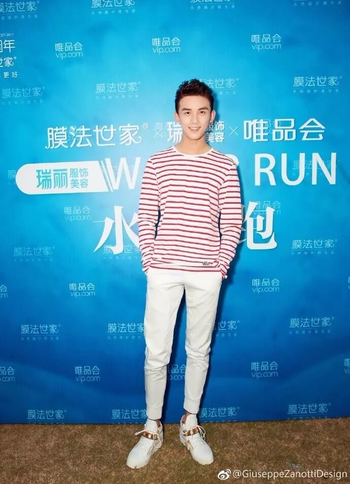 接下来这身也是一样,Burberry的红白条纹tee搭配白裤子虽然没有蓝色但也穿出了海洋风,而且这身吴磊看起来好小,完全就是一个少年模样。