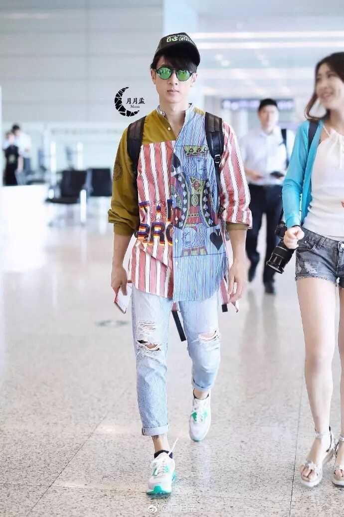 再来看一位衬衫先生,吴尊最近也因为某电影的活动一直在跑宣传。机场这身Stella McCartney的拼接衬衫搭配浅色破洞牛仔裤看起来真的小,说只有十八我也是信的。