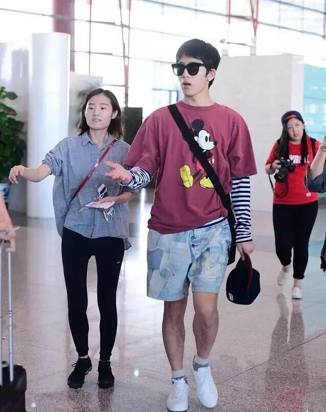 是不是每个男生心里都住了一个小男孩儿,米奇mouse,拼接短裤再配上他有点西瓜头的发型,井柏然本周这身是真的有点儿可爱。