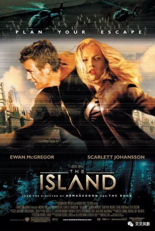 一样是岛,由迈克尔·贝执导的《逃出克隆岛》描述了一个近未来的世界,一群因为世界毁灭而幸存的人,等待著前往美丽的岛屿进行新的人生,不过最终发现他们不过是一群生化公司的复制人,用来当作真实世界有钱人的替代品。