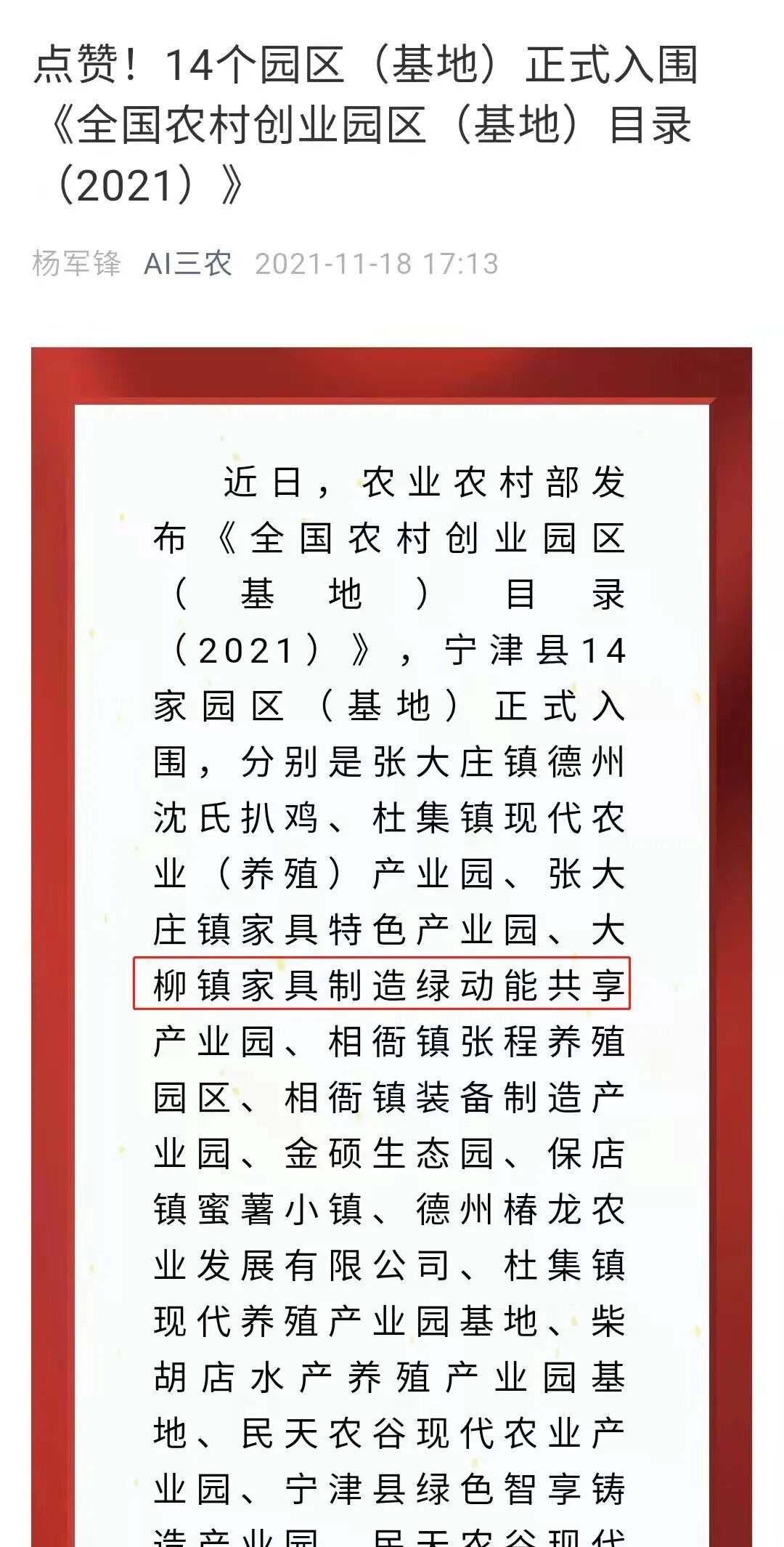 家具制造绿动能共享园区纵深发展。2021年,大柳镇家具制造绿动能共享园区顺利通过市级现代农业产业园验收审核并荣登农业农村部《全国农村创业园区(基地)目录(2021)》,园区内的山东省木质家具质量检验中心被评为德州市中小企业公共服务示范平台,《纾“痛点”通“堵点” 见实效》登上山东电视台新闻联播平台。