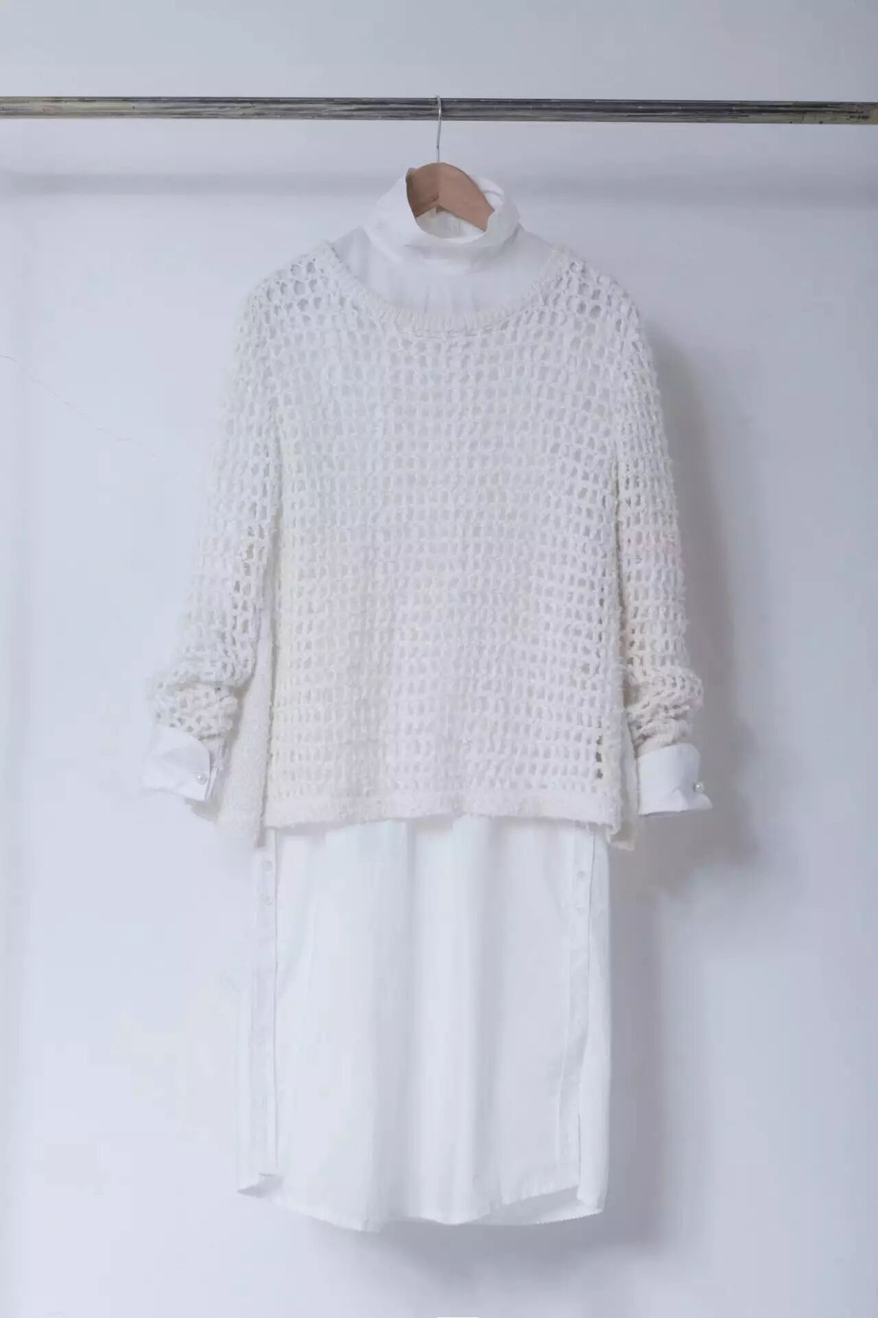 ▲ 百搭的白色针织上衣,由于毛料含麻质成份,故毛纱上会有凹凸的毛圈效果,麻质的面料轻巧,此件上衣的特别之处在于全人手勾制。