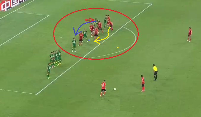 先给大家介绍一下,角球时本方禁区人多,所以会采用人盯人的方式,布鲁诺安排的是金玟哉盯防对象是阿瑙托维奇。而对于任意球,由于本方需要站人墙,所以禁区内人手不足,通常会在采用区域防守。