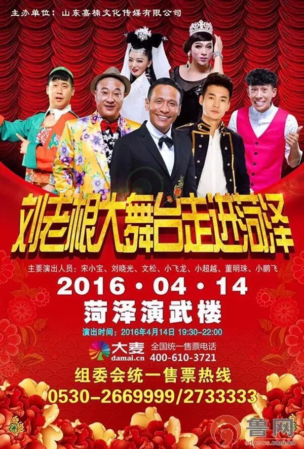 4月14日晚19:00,“刘老根大舞台”将走进菏泽演武楼。届时,宋小宝、刘小光(赵四)、文松、董明珠、小超越等喜剧明星将为菏泽市民带来一台喜剧盛宴。