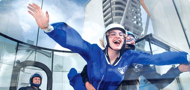 通过垂直风洞产生气流,让你体验在游轮上空飞翔的豪兴,是安全,可控的娱乐项目。适合3岁及以上年龄的乘客;配有专业教练。