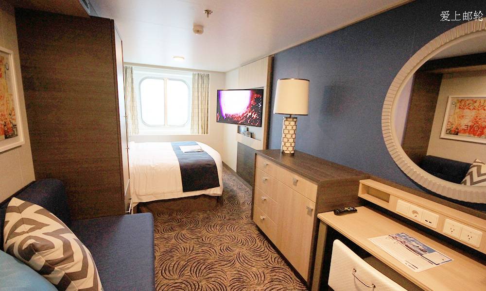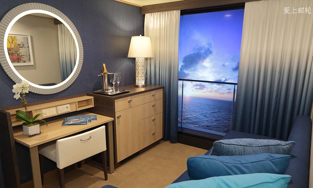全新设计内舱房,拥有19-21平米空间,提供你前所未有的海上高科技体验——虚拟阳台。其自下而上的落地高清屏幕将为你呈现即时海景和目的地景色。