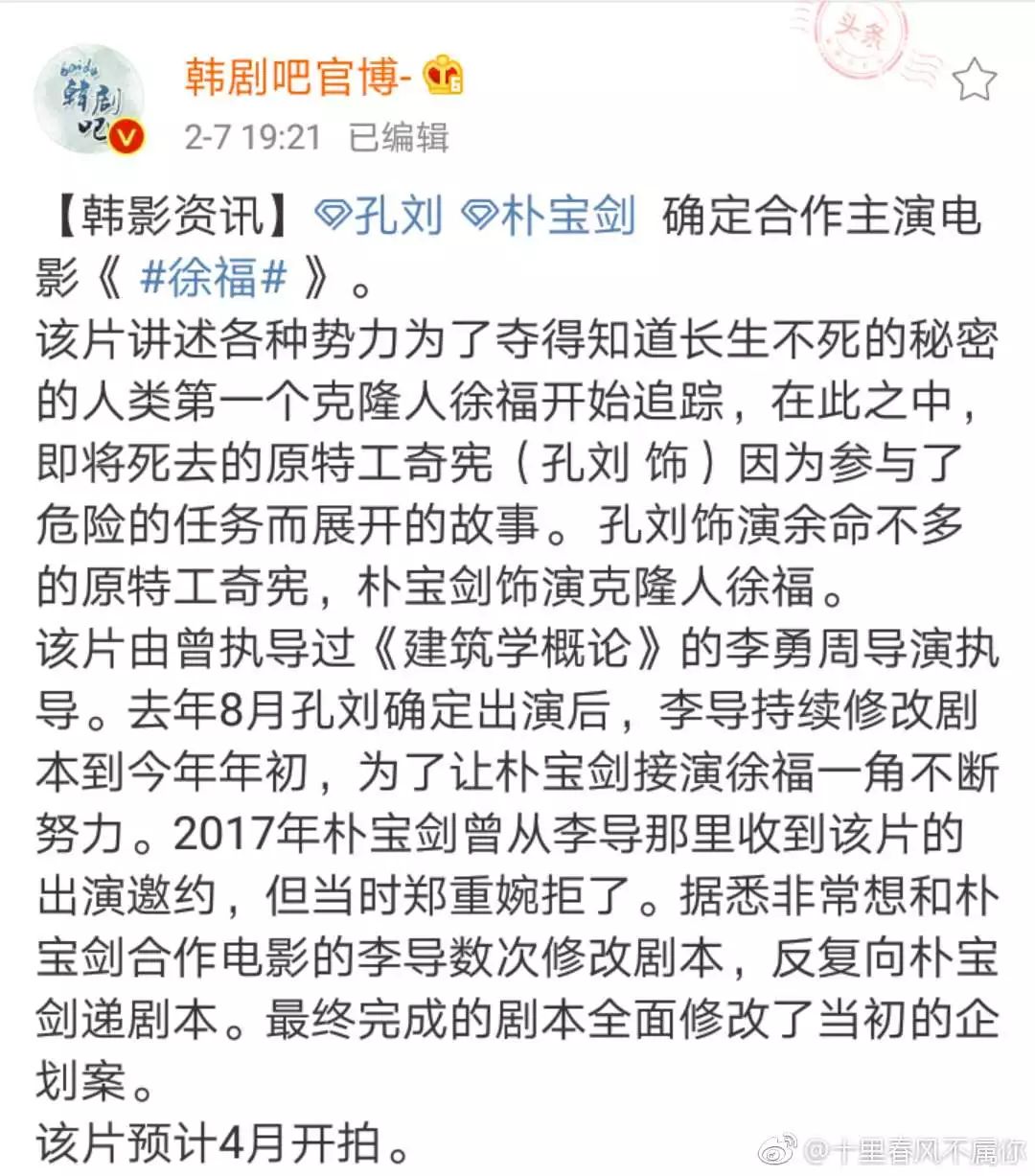 休息了快两年的孔刘大叔终于又要拍戏了,这次是和朴宝剑合作的电影《徐福》,朴宝剑饰演知道长生秘密的克隆人徐福,而孔刘饰演调查的情报要员,预计这部戏将要在4月开拍。